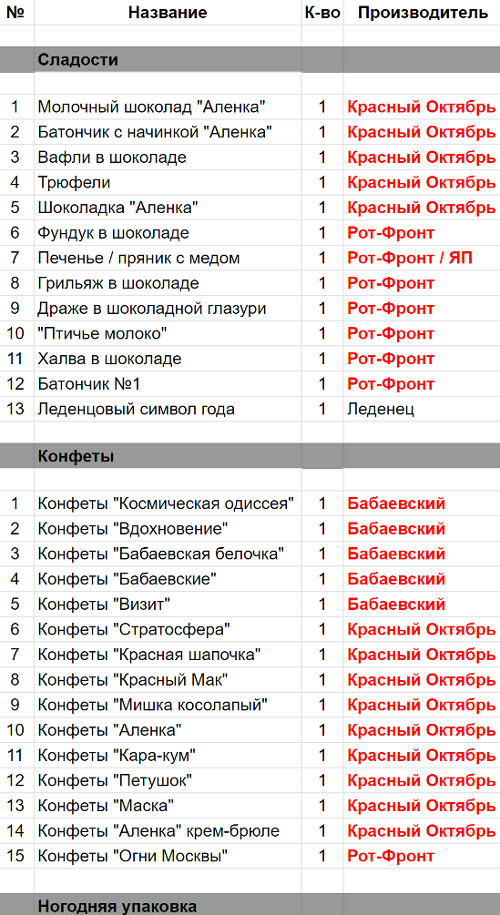 Молочный шоколад "Аленка" (1 шт), Батончик с начинкой "Аленка" (1 шт), Вафли в шоколаде (1 шт), Трюфели (1 шт), Шоколадка "Аленка" (1 шт), Конфеты "Красная шапочка" (1 шт), Конфеты "Красный Мак" (1 шт), Конфеты "Мишка косолапый" (1 шт), Конфеты "Аленка" (1 шт), Конфеты "Кара-кум" (1 шт), Конфеты "Петушок" (1 шт), Конфеты "Маска" (1 шт), Конфеты "Аленка" крем-брюле (1 шт)